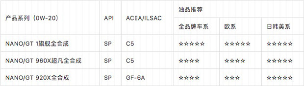 1.NANO/GT 1 C5/SP 0W-20 旗艦級全合成機油; 2.NANO/GT 960X C5/SP 0W-20 超凡全合成機油; 3.NANO/GT 920X SP GF-6A 0W-20 全合成機油;