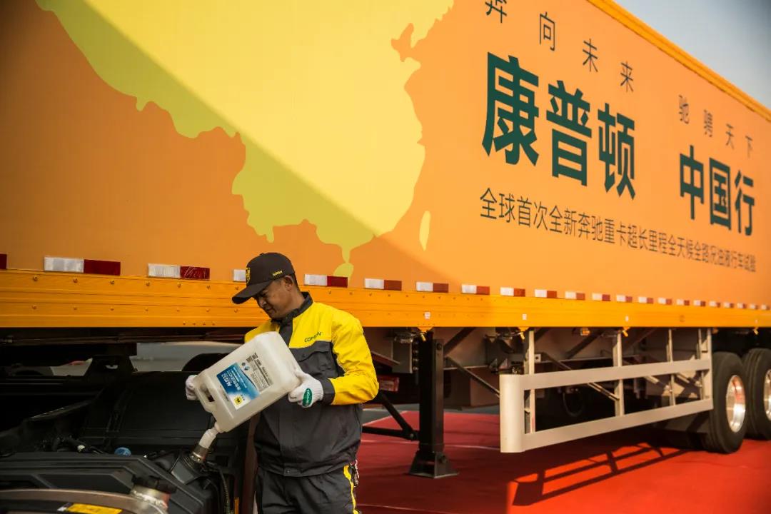 隨著主持人宣布換油儀式開始,專業的重卡保養技師將全車油液放出,并更換康普頓全系油液產品。